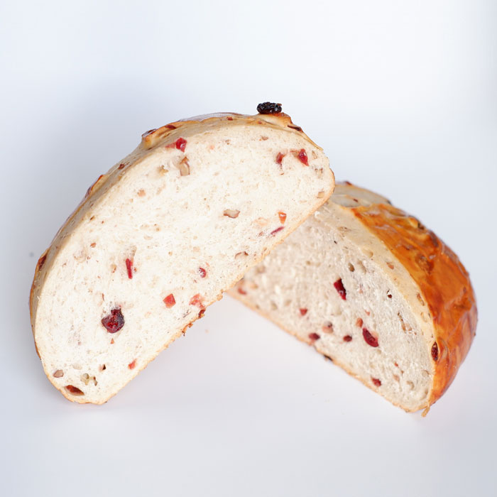 甘酸っぱいドライクランベリーとマイルドで食感の良いピーカンナッツを生地に混ぜ込みました。シナモンの風味をきかせたブリオッシュタイプのソフトな食感です。スライスして食べるのがオススメです。